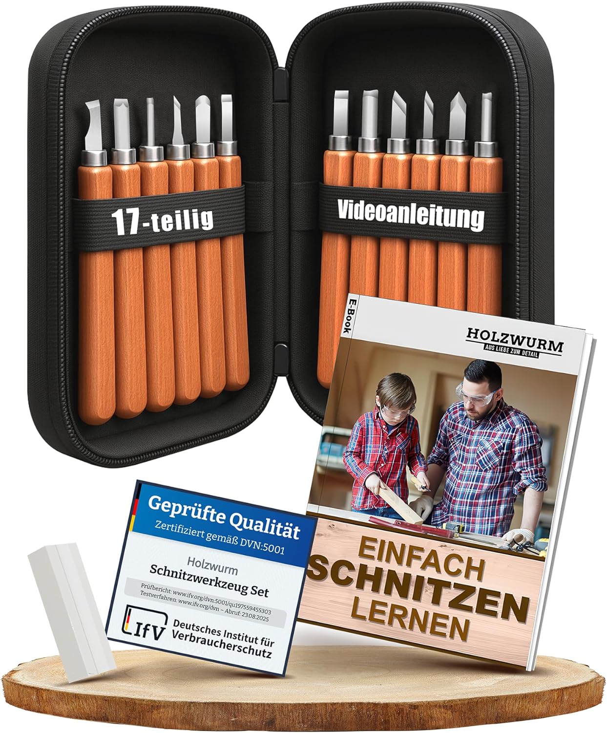 HOLZWURM Holz-Schnitzwerkzeug Set – 17 teilig, inkl. Anleitung für ein Schnitzprojekt & E-Book für Einsteiger, Tasche & Abziehstein, ideales Schnitzmesser-Set für Anfänger und Profis